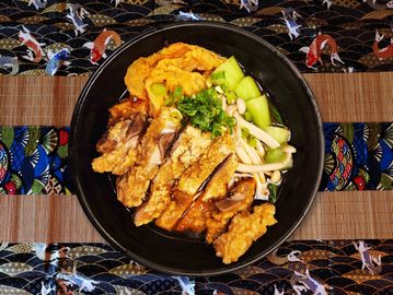Fried Chicken Cutlet, Bok Choy, Mushroom, Seasoned Tofu & Chopped Scallion