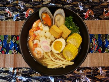 Scallop, Mussel (2pcs) & Jumbo Shrimp (4pcs), Chopped Scallion, Corn, Mushroom, Fish Tofu, Naruto & Seasoned Boiled Egg (1/2)